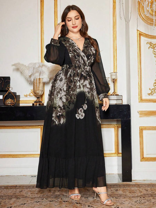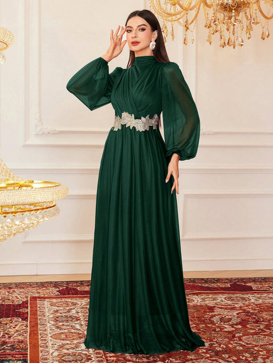 Plus Size Chiffon Lantern Sleeve Round Neck Diamond Decor Flowing Maxi Evening Dress
