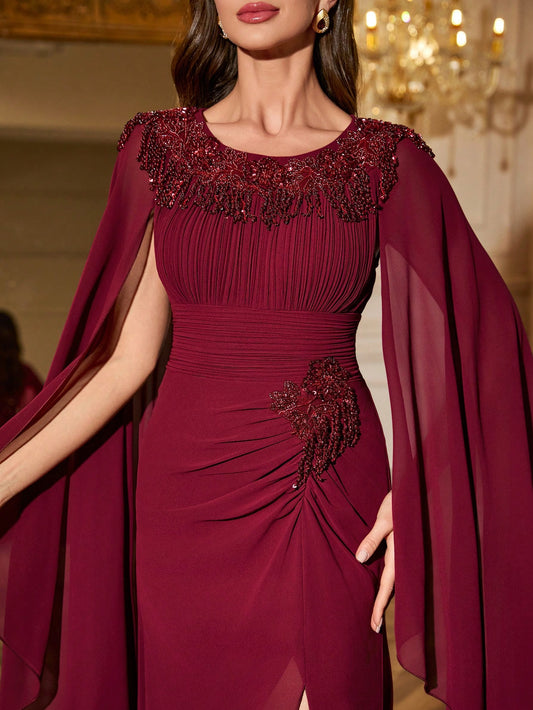 Round Neck Cape Sleeve Ruched Waist Slim Fit Dress With Handcraft Beading Evening Dress