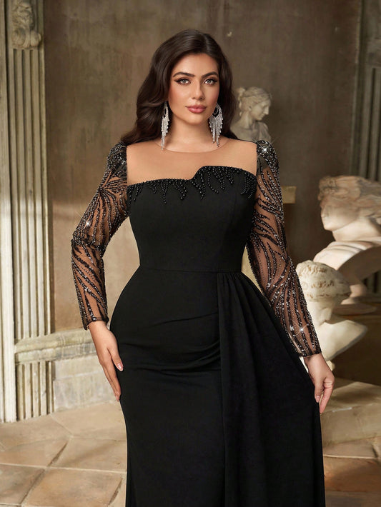 Plus Size Collar Cloud Sleeve Sequin Applique Pleated Slim Hip Evening Dress