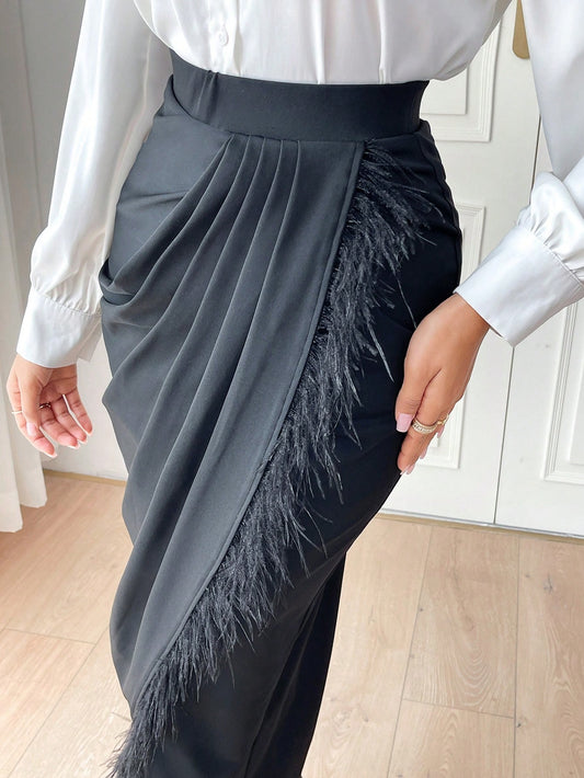 Faux Camel Feather Overlapping Wrap Skirt