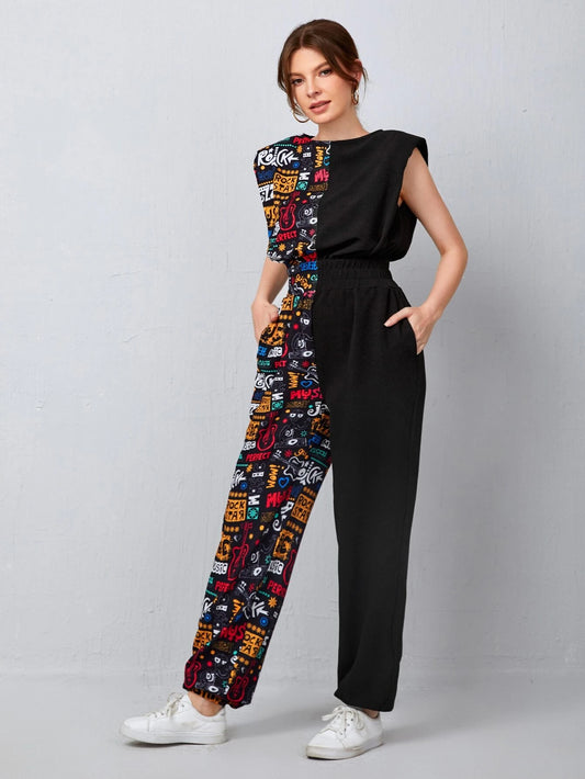 Shoulder Pad Letter Graphic Jumpsuit
