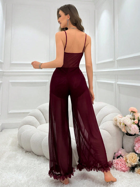 Lace Detailing Hollow Out Mesh Cami Jumpsuit Lingerie