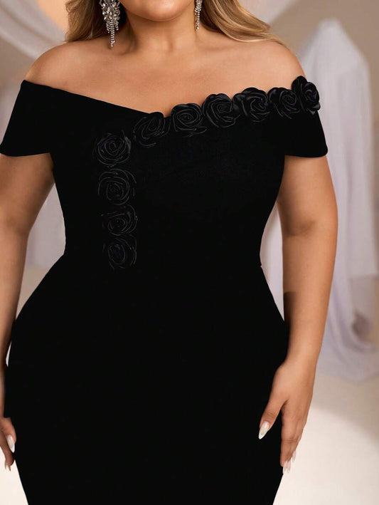 Plus Size Black 3D Floral Decor Off-Shoulder Formal Evening Dress