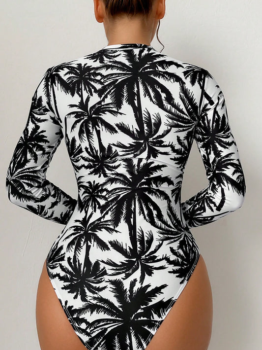 Tropical Plant Print Long Sleeve One-Piece Swimwear