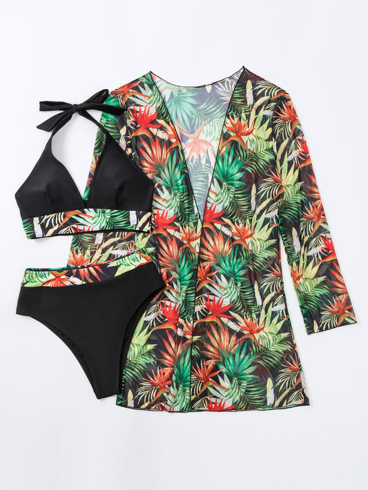 Tropical Print Bikini Set Halter Wireless Bra , High Waist Bottom & Long Sleeve Kimono 3 Piece Swimwear
